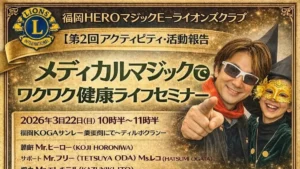 第2回 魔法社会奉仕活動シニア健康ライフ笑顔支援(福岡県古賀市) ■日時 2026年3月22日(日)10:30〜11:30 ■エリア 福岡県古賀市 ■会場 福岡古賀サンレー紫雲閣 館内見学会イベント内にて開催 ■テーマ […]