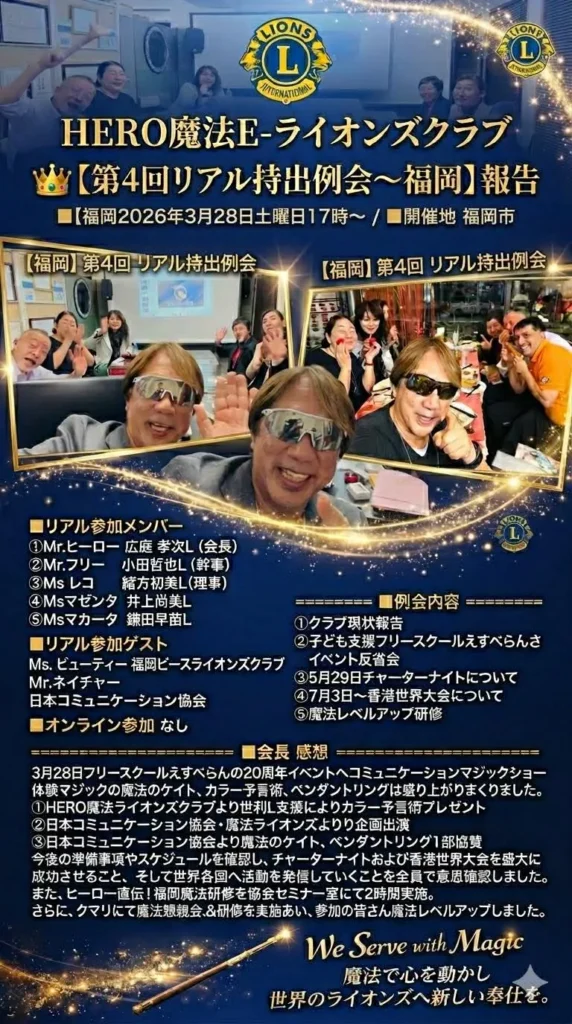 世界初(?)の「福岡HEROマジックE−ライオンズクラブ」第1回持出例会は、チャーターメンバー4名で開催しました。